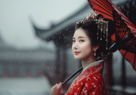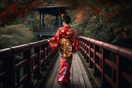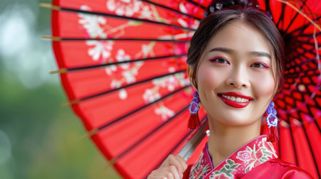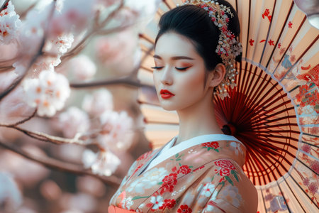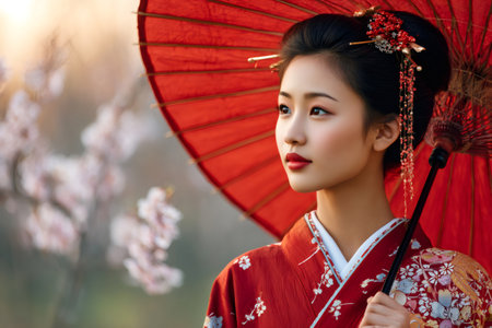 A woman wearing a traditional Japanese kimono and holding a red umbrella. Concept of elegance and cultural appreciation