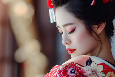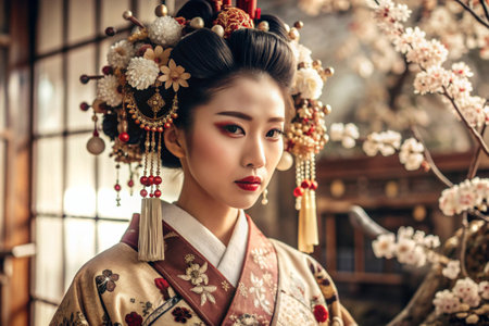 Young Asian woman in a traditional kimono with a delicate floral design, styled with an elegant geisha-inspired hairstyle.