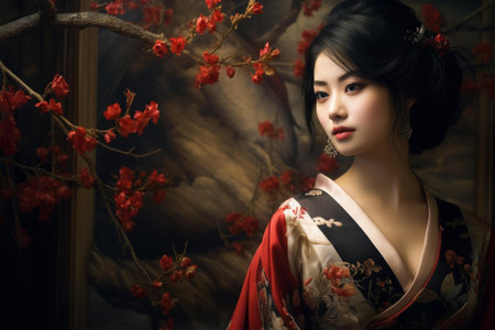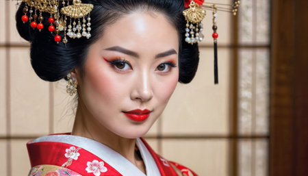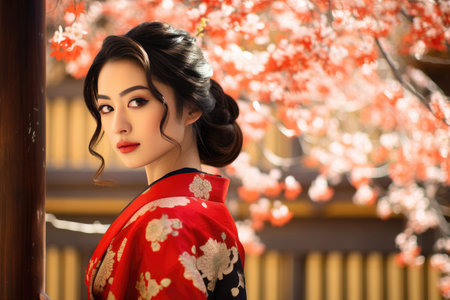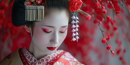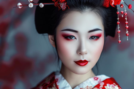 A stunning woman wearing a red kimono adorned with vibrant flowers in her hair. Perfect for cultural and fashion-related projects.