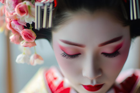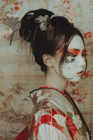 Young japanese woman applying white make up, wearing an elaborate kimono and traditional hair bun, portraying a captivating look of contemplation and tradition