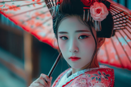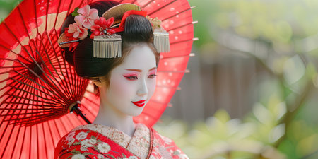 Elegant Geisha with Red Umbrella, Traditional Japanese Cultural Fashion