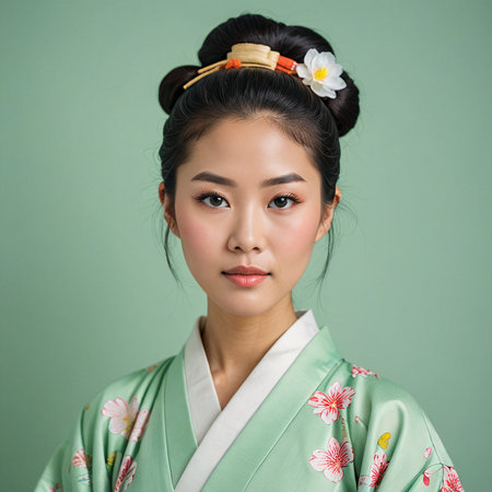 Serene Asian Woman in Traditional Kimono with Bun Hairstyle