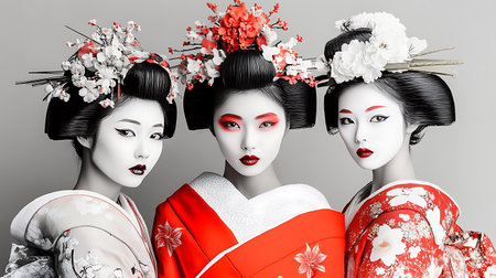 Geishas in traditional attire, vibrant makeup and hair accessories, cultural parade