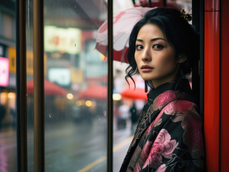 Elegant Geisha girl. Sad woman travel. Generate Ai