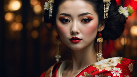 Close-up Asian woman in vibrant red and gold kimono with floral patterns. Her hair is styled in an updo with flowers, and she wears delicate pearl earrings. Soft pink makeup