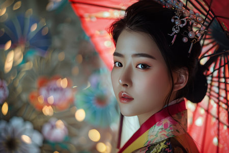 A young woman wears an ornate traditional outfit adorned with vibrant colors and flowers. She holds a stunning umbrella exuding elegance and grace in a peaceful environment.