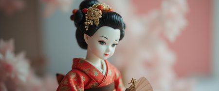 This enchanting image features a beautifully crafted doll dressed in a vibrant red kimono adorned with intricate patterns, exuding elegance and cultural richness. With delicate features and a serene expression, she holds a fan, surrounded by soft pink blossoms that enhance the atmosphere of tranquility and grace.
