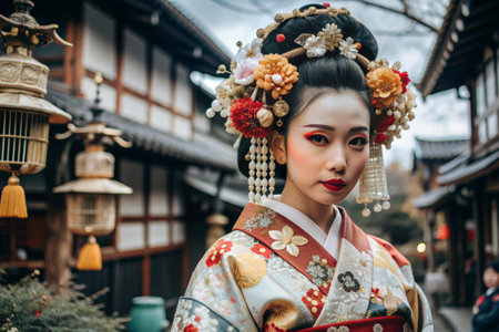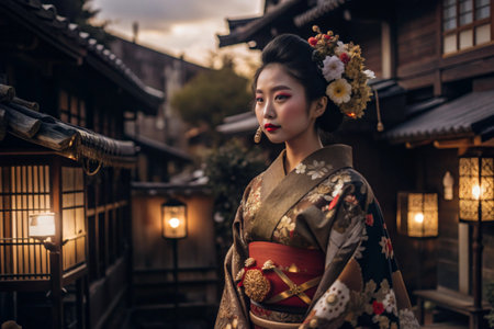 Geisha woman in kimono, graceful performances in Kyoto's historic district
