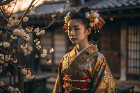 A Japanese geisha in a traditional costume walks in the park, Generative AI content