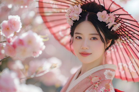 Beautiful Japanese girl in a traditional kimono holding umbrella near blooming sakura