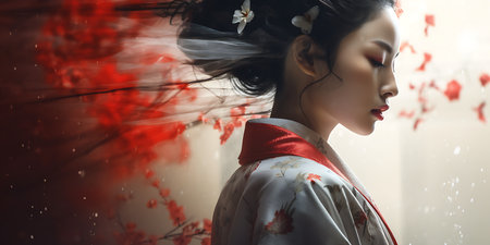 Portrait of beautiful young Japanese woman in traditional costume, copy space