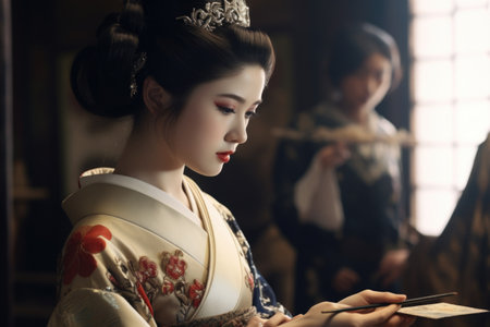 A woman dressed in a traditional kimono is seen looking at her cell phone. This image can be used to depict the blend of traditional and modern cultures or to illustrate the use of technology in everyday life.