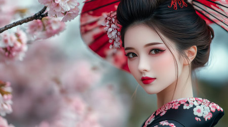 Geisha wearing traditional Japanese clothing and makeup poses with red umbrella under cherry blossoms