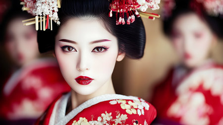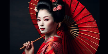 AI Generated. Japanese geisha woman in red dress Japan exotic travel and traditional culture