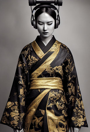 A young beautiful geisha in a kimono and headphones. Portrait of a beautiful geisha in a black and gold kimono. 3D rendering.