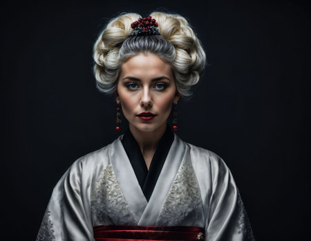 Fine art portrait of beautiful woman in Japanese Geisha style wearing kimono