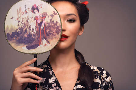 Portrait of young beautiful Asians in grey kimono and with a fan