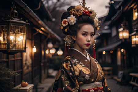 Geisha woman in kimono, graceful performances in Kyoto's historic district