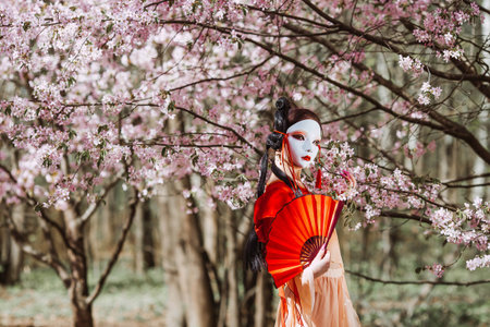 The portrait symbolizes the traditions and culture of the Japanese people. A woman wearing a Japanese mask on her face, traditional clothing, and a fan in her hand, surrounded by cherry.