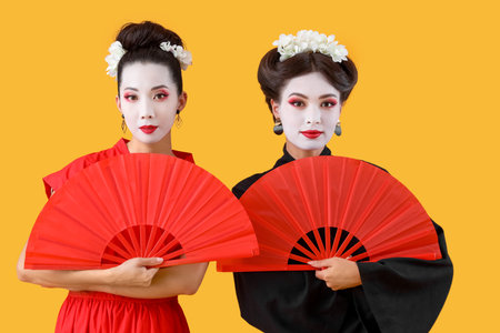 Beautiful young geishas with fans on yellow background