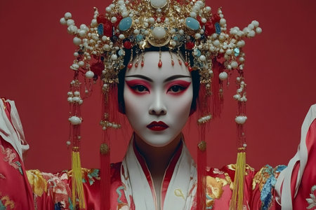 Beautiful Chinese opera singer wearing an elaborate headdress and traditional red costume poses against a vibrant red backdrop
