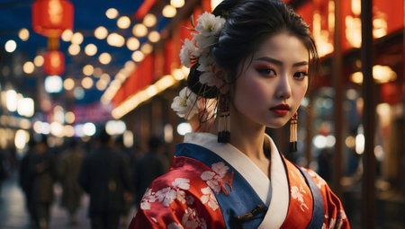 Portrait of a beautiful Asian woman wearing a kimono at night