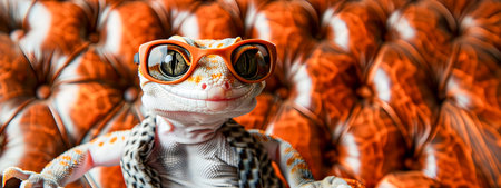 A cool lizard with orange sunglasses, looking stylish against a teal background