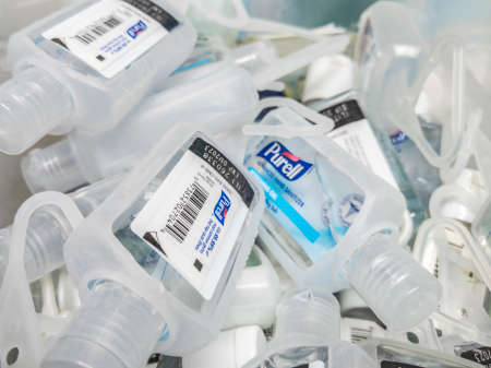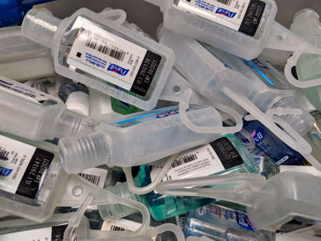 Seattle, WA / USA - circa March 2020: Bin filled with small Purell hand sanitizer bottles, perfect for attaching to bags.