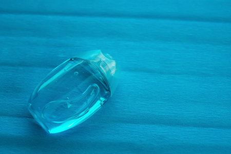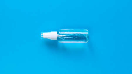 Hand sanitizer transparent bottle with spray cap at the middle of blue background. Simple flat lay with pastel paper texture. Medical concept. Stock photography.