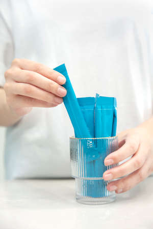 Close up view of colorful dishwasher capsules in male hand on blue background.