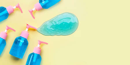 Alcohol hand sanitizer gel in pump bottle on yellow background. Copy space