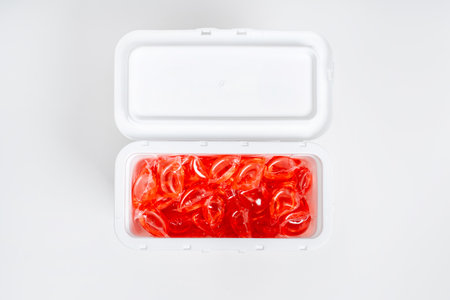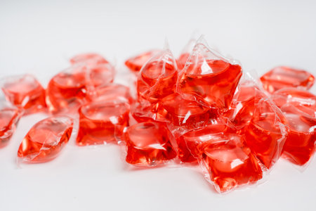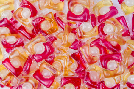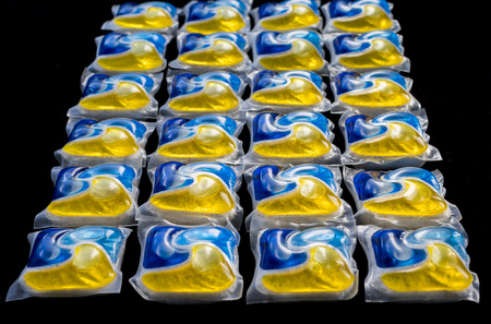 Dishwasher detergent capsules and or laundry soap close-up background.