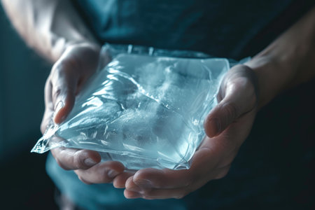 A person holding a filled plastic bag in their hands, likely containing groceries, An ice pack being used to soothe a swelling, AI Generated