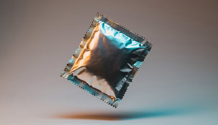 This image features a hand holding a square packet of a condom against a white background. The packet is metallic and reflective, and the hand is positioned to clearly display the packet. The image is well-lit and focuses on the packet, making it the central element. The white background ensures that the packet stands out prominently.