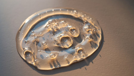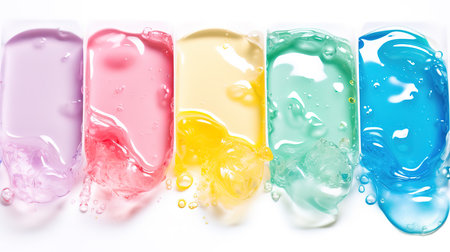 Cosmetic gel, serum swatches. Gel texture. Clear cosmetic liquid drop. Transparent skincare product with bubbles sample. Close up.