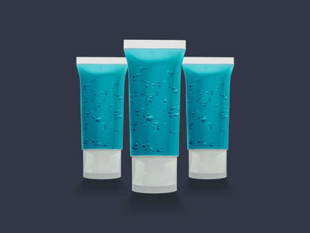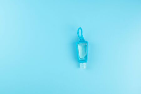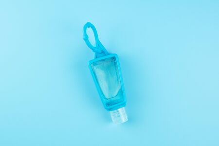 Pocket antiseptic hand sanitizer gel isolated on blue background, no label. Small bottle of transparent blue antibacterial liquid with oxygen bubbles, round granules. Hydro