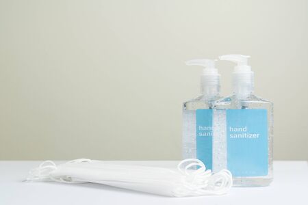 Coronavirus prevention and hand sanitizer gel medical surgical masks for hand hygiene corona virus protection.Germ prevention concept