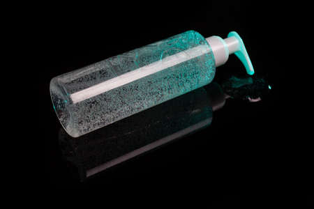 Antiseptic bottle with blue liquid on black background