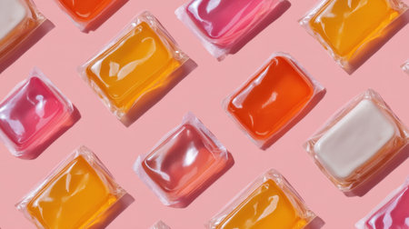 A vibrant arrangement of colorful laundry pods on a pink background, showcasing a variety of clear packaging options. These pods offer convenient cleaning solutions for modern households, emphasizing aesthetics and functionality.
