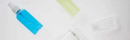 panoramic shot of cosmetic bag and bottles with liquids on white background