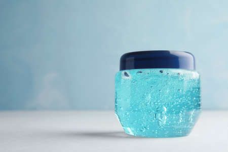 Jar of cosmetic gel on white table against light blue background, space for text