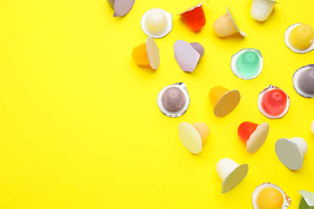 Tasty bright jelly cups on yellow background, flat lay. Space for text