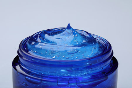 Jar of transparent cosmetic gel on light background, closeup