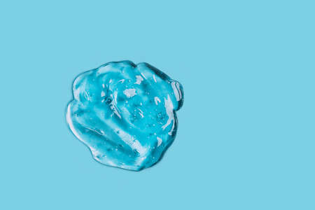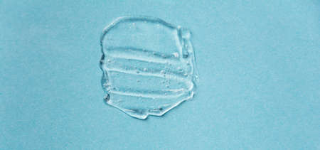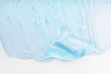 Clear skincare product smudge closeup. Cream gel blue transparent cosmetic sample with bubbles isolated on white background. Face serum texture. Hand sanitizer, hygiene liquid gel