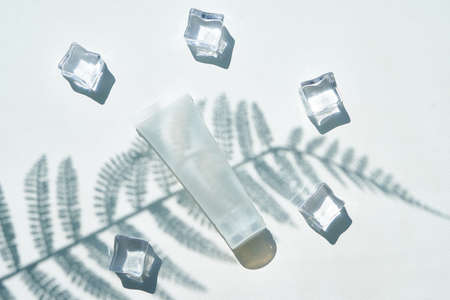 Cosmetic bubble and ice on a background of beautiful palm shadows. Mock up