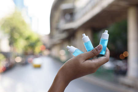 The hand holding small bottle of blue sanitizer ethyl alcohol hand gel, big and small size, place on the wall nearby the junction in the city, important thing for protect coronavirus, covid19