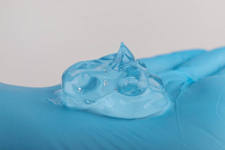 Cosmetic or medical gel on a gloved hand on white background. Close up.