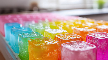 A close-up shot of a colorful silicone ice cube tray filled with sparkling water, ready to freeze, showcasing the vibrant hues against a bright kitchen background.