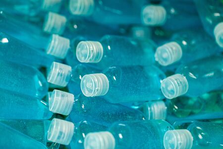 Closeup blue gallon bottle of clear alcohol refill with shockproof plastic. Coronavirus and covid-19 prevention concept