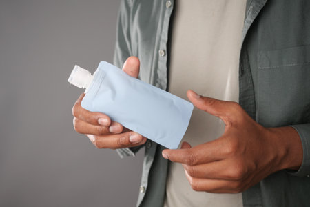 Hand holding red foil packet against gray background for product packaging concept.